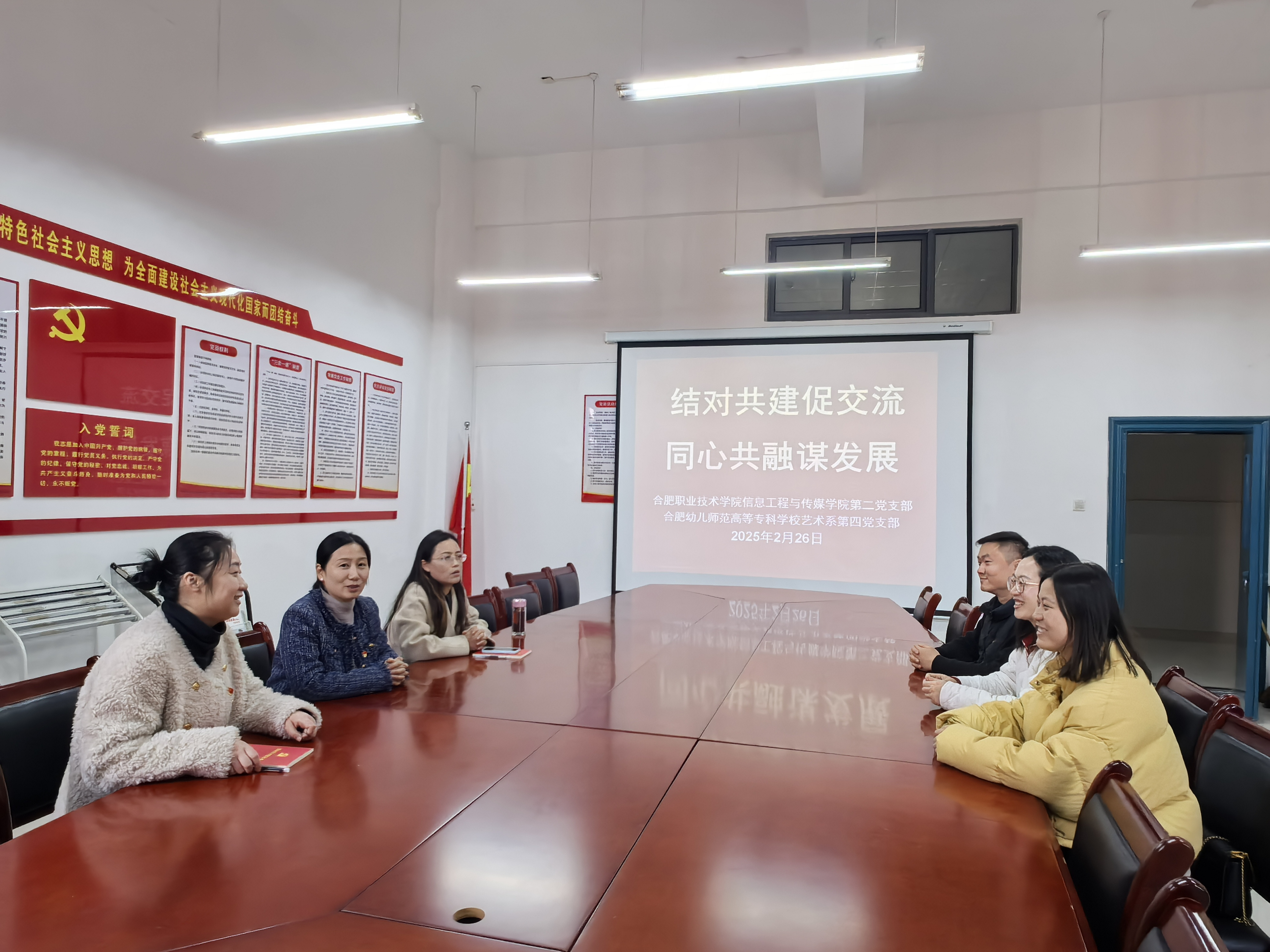 参观结束后,大家围绕“结对共建促交流、同心共融谋发展”主题进行了座谈,双方就党建品牌打造、专业发展创新等问题进行了深度交流。合肥幼儿师范高等专科学校艺术系的党员老师也介绍了他们在基层党组织建设、人才培养、课程开展、实验室管理、活动组织方面的特色和经验。双方一致表示,将以此次党建联建活动为契机,进一步加强沟通联系,深化合作交流,共同探索依托党建引领专业发展工作的新思路、新方法。此次活动不仅加深了两校艺术相关专业之间的友谊,也为促进学校高质量发展注入了新的动力。未来,两个支部将继续保持密切联系,加强交流与合作,共同书写党建引领下的高质量教育事业发展新篇章。(供稿:信息工程与传媒学院 骆阳 初审:尹仕果 审核:杨璨)