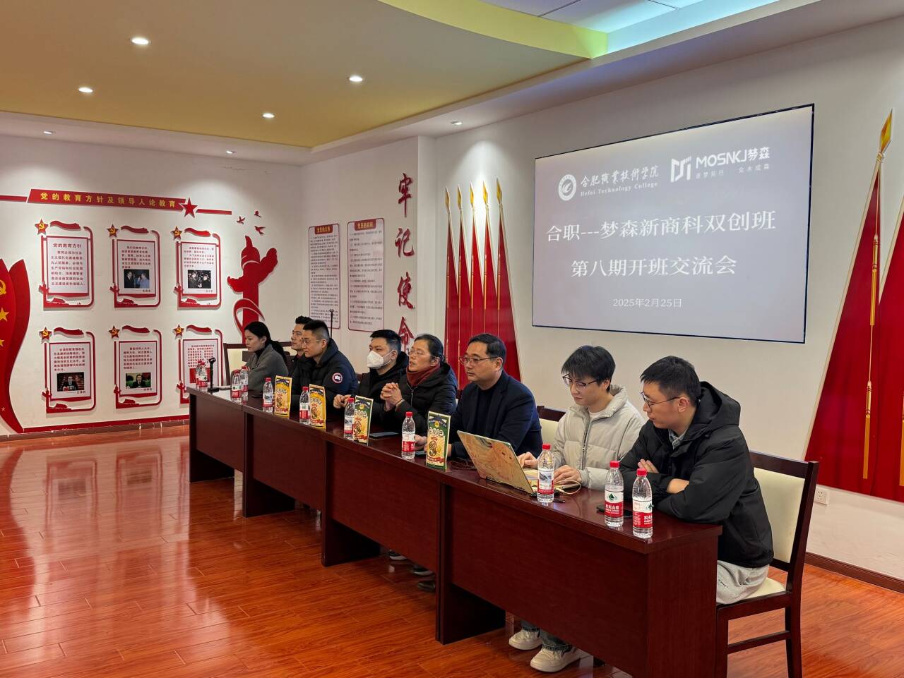 2月25日下午,第八期经贸旅游学院梦森双创班开班仪式于经贸楼党性体验馆举行。电商教研室主任王传芸、副主任潘治学、安徽梦森科技有限公司总经理吴捷、企业导师、项目导师、辅导员老师及23电商专业的25学员齐聚一堂,共同见证了这一重要时刻。此次开班仪式标志着第八期梦森新商科双创班正式启动,旨在进一步推动创新创业教育,培养具有创新精神和实践能力的未来领军人才。