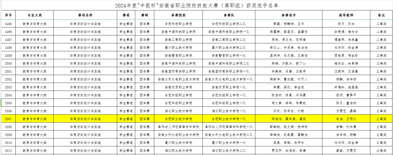1月13日-15日,由安徽省教育厅、省工业和信息化厅、省人力资源和社会保障厅联合主办的2024年“中银杯”安徽省职业院校技能大赛(高职组)“体育活动设计与实施”赛项,在安徽体育运动888集团学院成功举办。全省共计47支代表队,140多名运动员参加了该项赛事。我校此项参赛队伍由基础教育学院副院长(主持行政工作)施敏发担任领队,朱浩、王丽水两位党员教师担任指导老师。