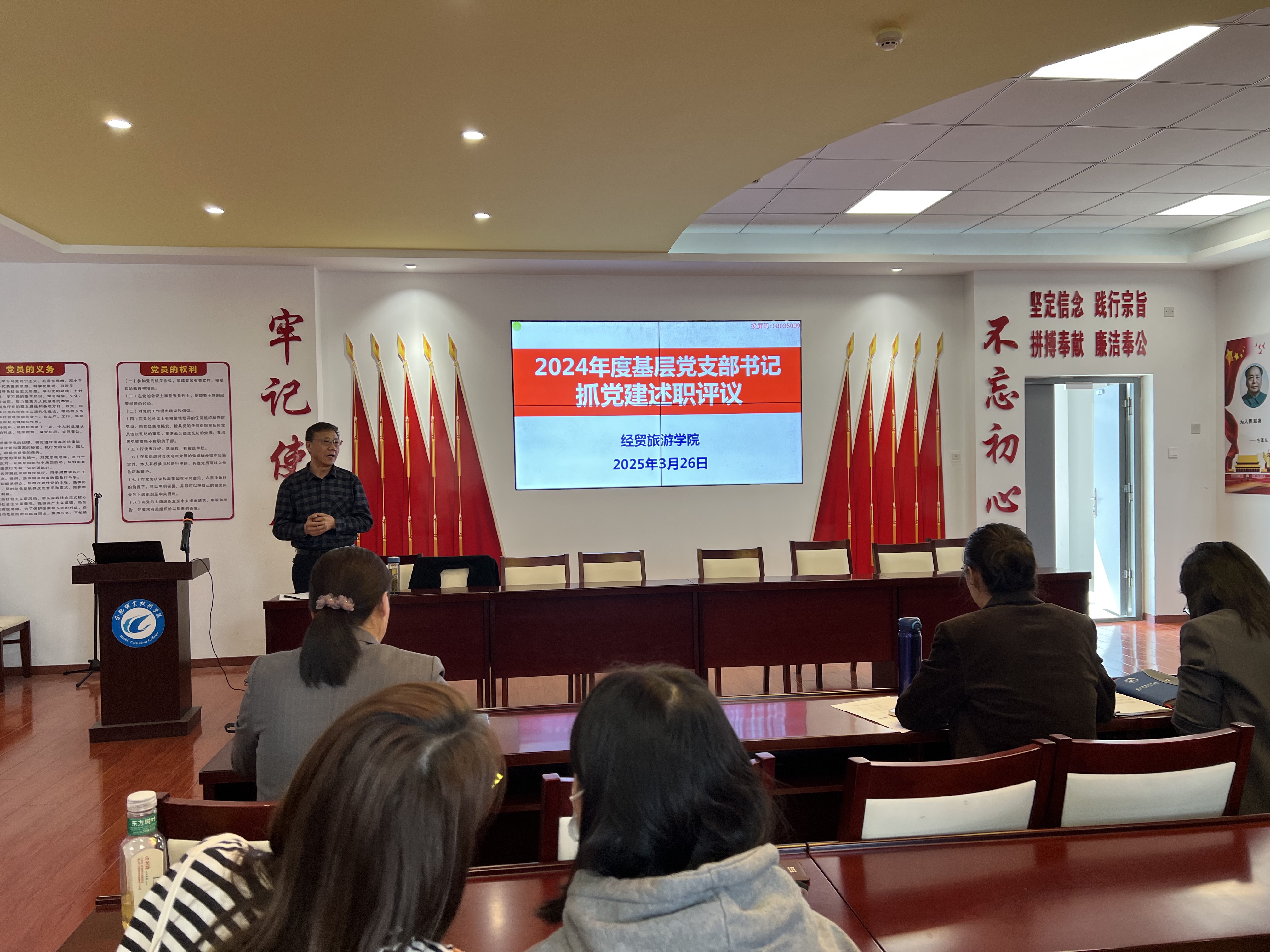 为贯彻落实学校党委工作部署,深入推动基层党组织党建工作高质量发展,3月27日,经贸旅游学院党总支召开2024年度党支部书记抓党建述职评议考核会。该院党政班子成员、各党支部书记、部分民主党派、党员、群众代表参加会议,会议由该院党总支书记梅亚松主持。