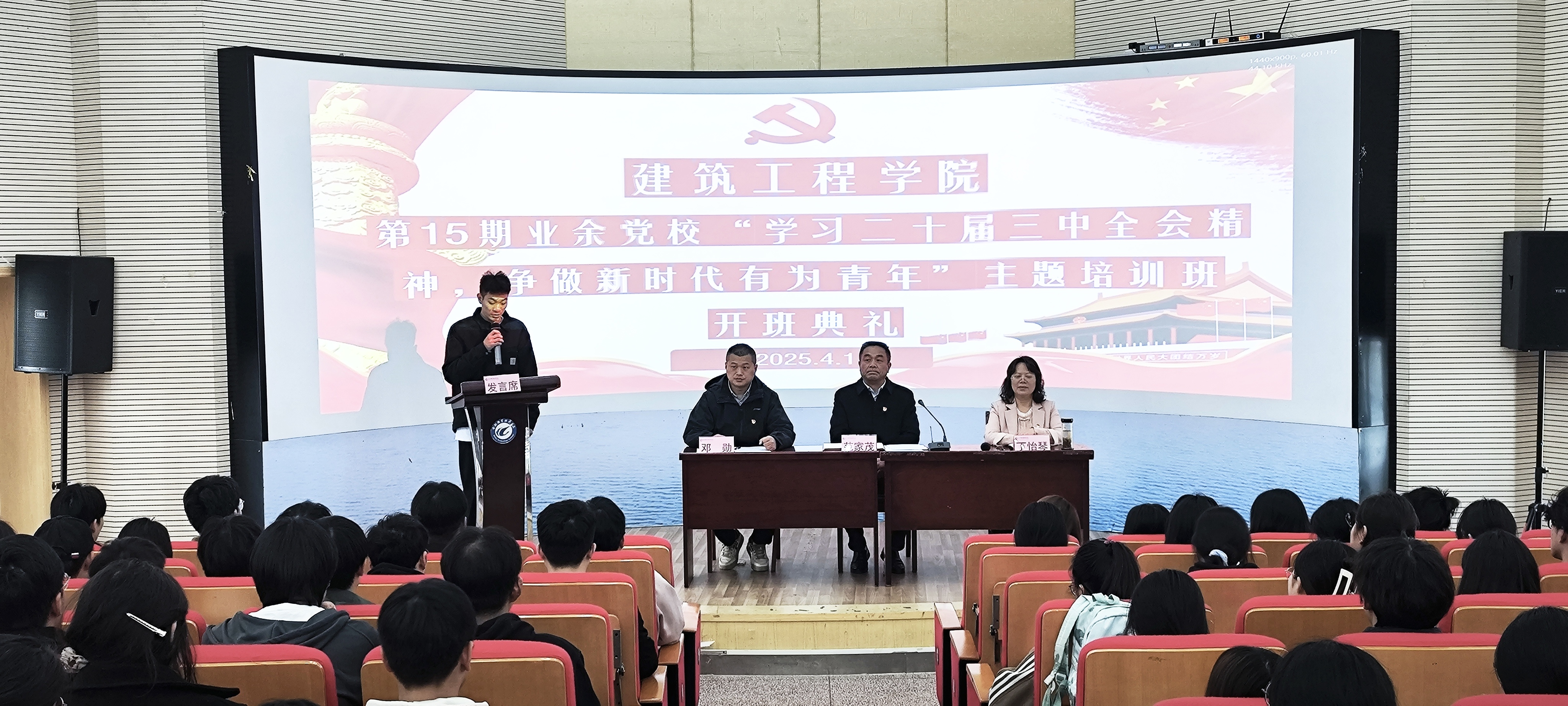 4月1日下午,建筑工程学院第十五期业余党校“学习党的二十届三中全会精神 争做新时代有为青年”主题培训班在鼓山校区图书馆二楼报告厅举行开班典礼。校党委委员、副校长范家茂,该院党政班子,2023级70名入党积极分子,以及2023级和2024级97名优秀团员参加了开班典礼,典礼由该院党总支委员、副院长邓勋主持。