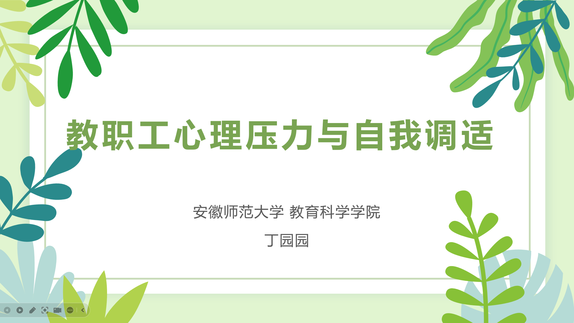 为科学缓解我校教师工作和生活压力,增强其自我心理保健能力,提升教职工的认同感和获得感,营造积极向上的工作氛围。4月16日上午,我校特邀安徽师范大学教育科学学院副教授,硕士生导师丁园园为教职工带来一场主题为“教职工心理压力与自我调适”的精彩讲座。