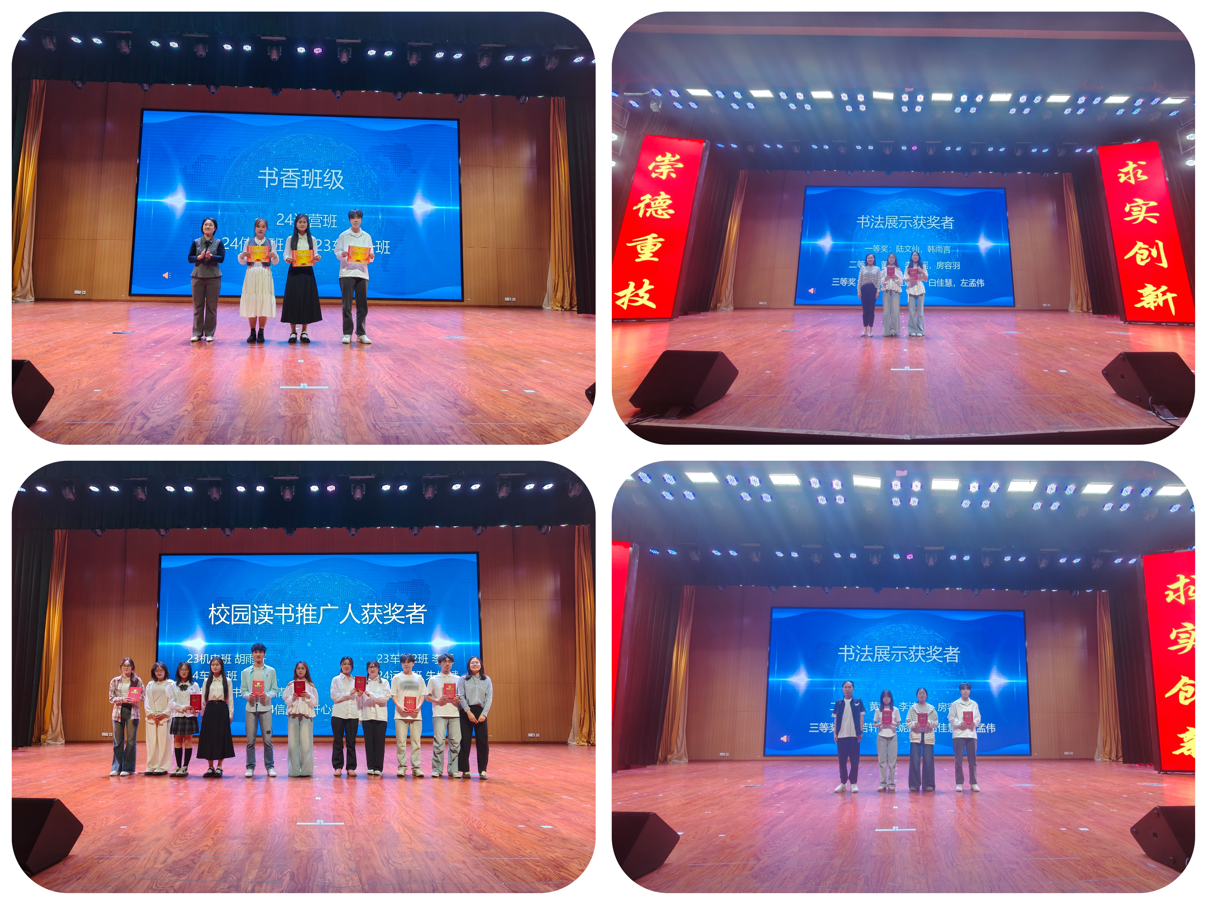 在表彰环节中,该院对在读书月活动中表现优异的个人与集体进行了表彰。24车辆2班王梦涵、24运营班魏冰冰等同学荣获了“21天打卡读书标兵”称号;23车辆2班白佳惠、24运营班黄屹等同学在“现场书法比赛”中取得了优异成绩;23机电班胡雨轩、23车辆2班李硕等积极投身于阅读推广,被评为“读书推广人”;24运营班、23车辆1班、24信号班在班级阅读氛围营造、读书活动组织等方面表现出色,被授予“书香班级”称号。
