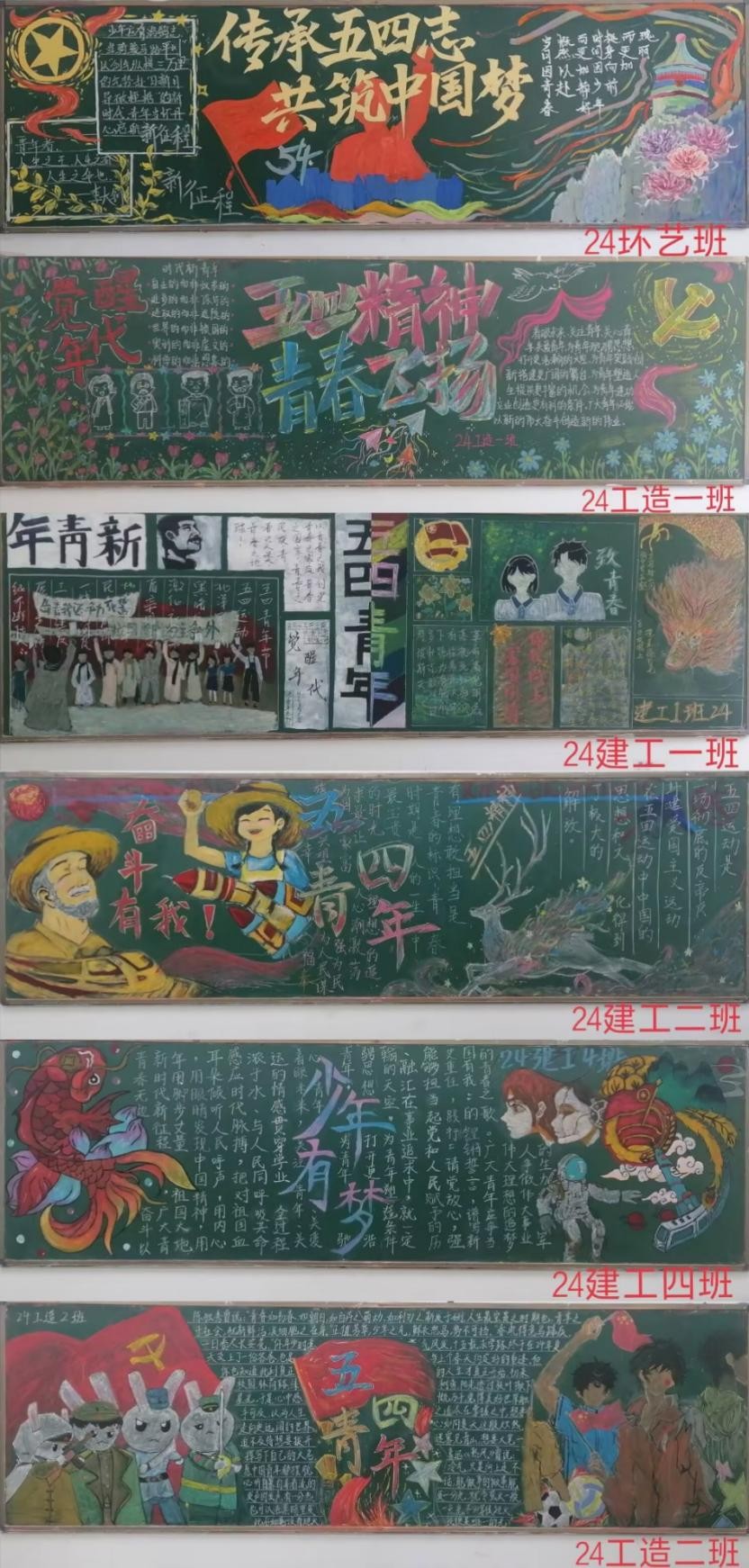 为弘扬五四精神,展现青年学子的艺术风采与创新思维,建筑工程学院开展“五四筑梦行”主题板报绘制评比活动。24级15个班级积极参与,经过激烈角逐,24环艺班等6个班级脱颖而出,分别斩获一二三等奖。