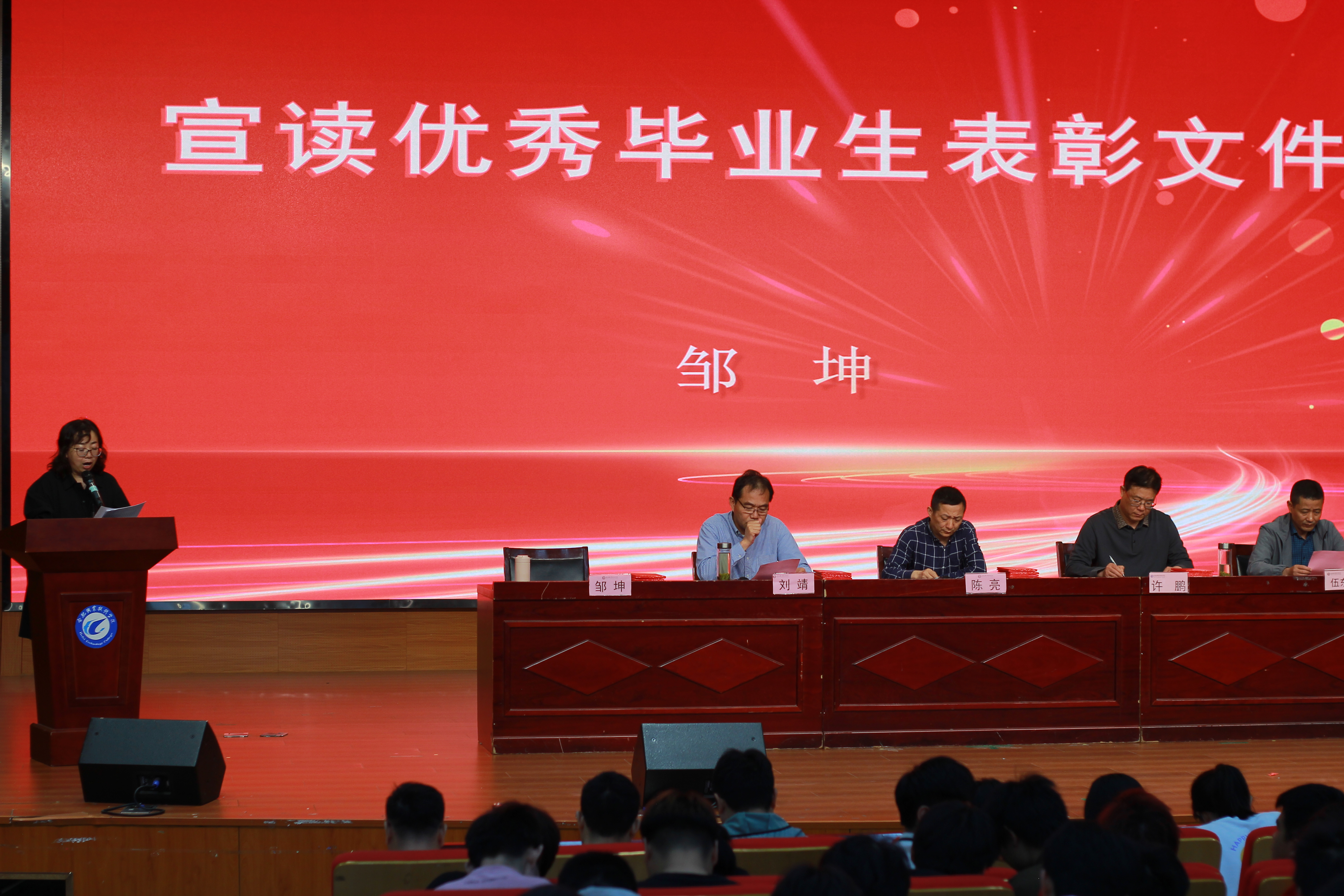大会在庄严的国歌声中拉开帷幕。随后,邹坤宣读省级、校级优秀毕业生名单,陈爽等19名学生获省级荣誉,邢海杰等65名学生获校级表彰。该院领导为省级优秀毕业生代表颁发荣誉证书,现场掌声雷动。其中,优秀实习生代表孙傲分享了自己的实习感悟。他回顾了校园生活的点滴,从课堂学习到社团活动,都成为其成长的基石。实习期间,他从最初的不安到逐渐适应,深刻体会到理论与实践结合的重要性,也明白了团队合作的价值,对未来职业规划有了更清晰的方向。