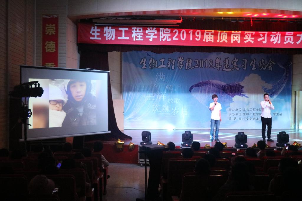 为做好生物工程学院2019届实习生动员工作,让学生明确实习目的、意义及要求,5月17日下午在大学生活动中心举行2019届毕业生顶岗实习动员大会曁欢送晚会。学校党委委员、副校长周晓隆,生物工程学院党总支书记宁业群,副院长(主持工作)裴正峰,党总支副书记林胜,副院长刘修树,以及各顶岗实习班级辅导员、实习指导老师和全体2019届毕业生出席了大会,大会由裴正峰主持。