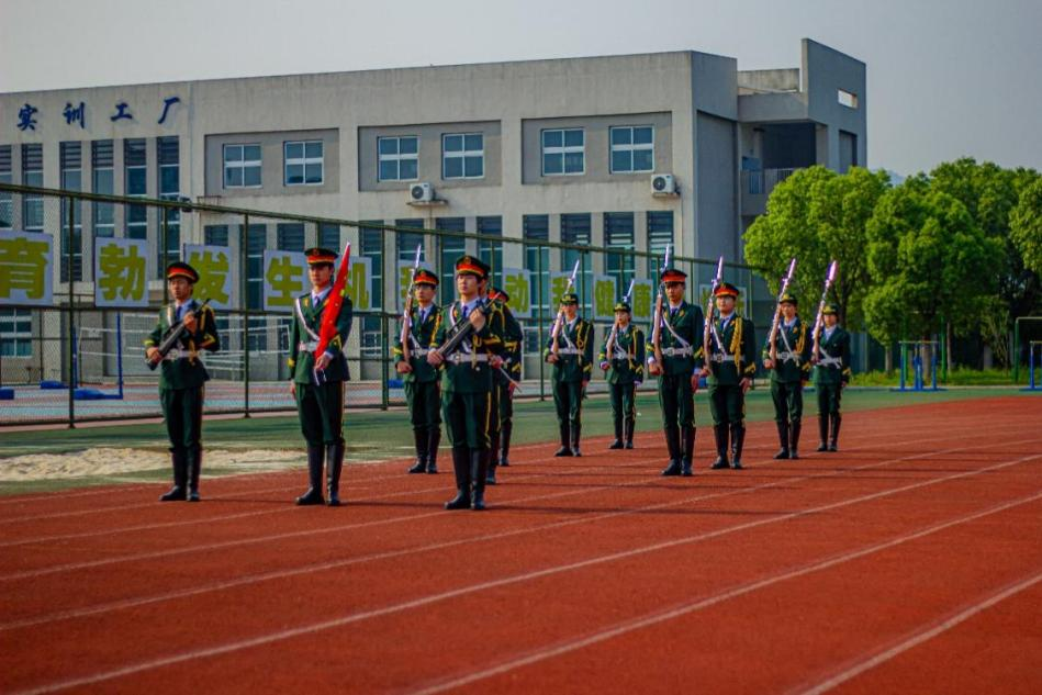 阳光初照,国旗护卫队的旗手们迈着坚挺的步伐向升旗台走来,随着激昂的国歌奏响,五星红旗冉冉升起,全体师生庄严肃立,齐唱国歌,注视着国旗的升起。