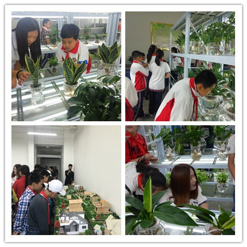 该院水培花卉产品引起了广大师生们的强烈关注,很多学生好奇地提问:“老师,这是海洋植物吗?”,“这个植物叫什么名字,有什么作用啊?”,“这是怎么做的啊,瓶子里是水吗?”…….面对可爱的孩子们的热情询问,园林专业老师和水培花卉兴趣小组的该院大学生给予耐心讲解,向孩子们讲解水培花卉的科普知识。活动中,该院园林技术专业学生做的植物标本“植物纪元”、“一叶知秋”、“金鸡唱日”和园林景观模型,同样也引来不少孩子们的喜爱。