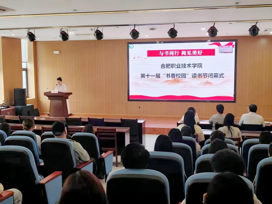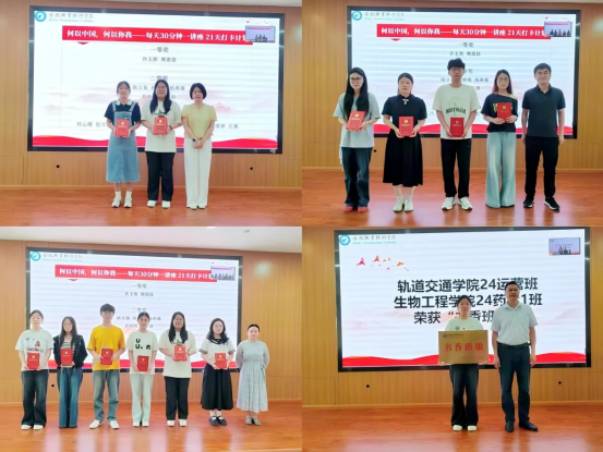 闭幕式上,主持人对本届读书节活动进行全面总结,本届读书节共吸引全校 10862 人次师生热情参与,开展的系列阅读活动精彩纷呈,极大激发了师生的阅读兴趣。随后,在座领导为“何以中国,何以你我——每天30分钟一讲座 21天打卡计划”活动中表现优异的17位获奖同学颁奖;并授予轨道交通学院24运营班、生物工程学院24药学1班“书香班级”称号。接着,四名“合职最美朗读者” 获奖学生带来精彩汇报演出,用饱含深情的诵读传递书籍魅力。
