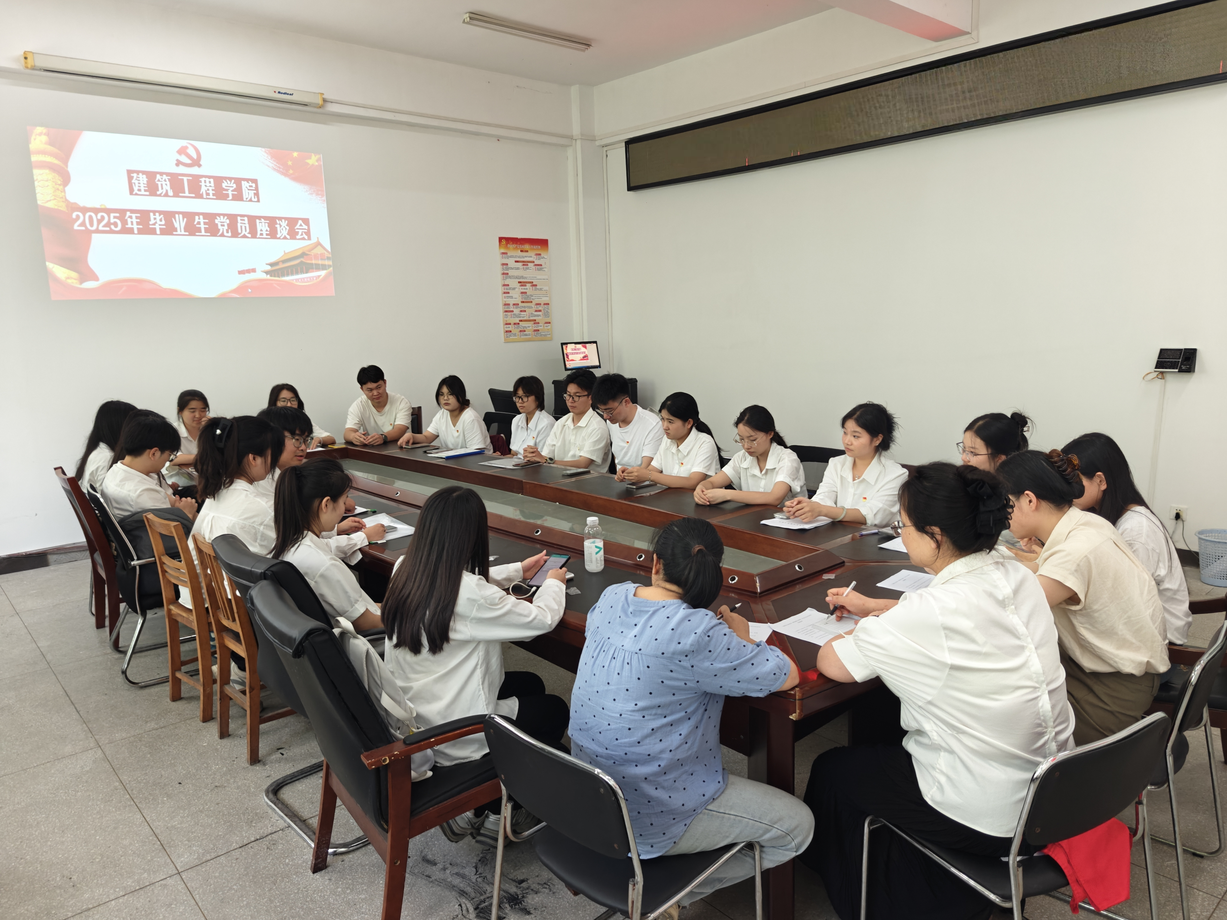 6月17日下午,建筑工程学院党总支在科技楼208党员活动室举行2025届毕业生党员座谈会。第四、第五党支部部分教师党员、全体毕业生党员参加了本次座谈会。会议由专职组织员金琼琼老师主持。
