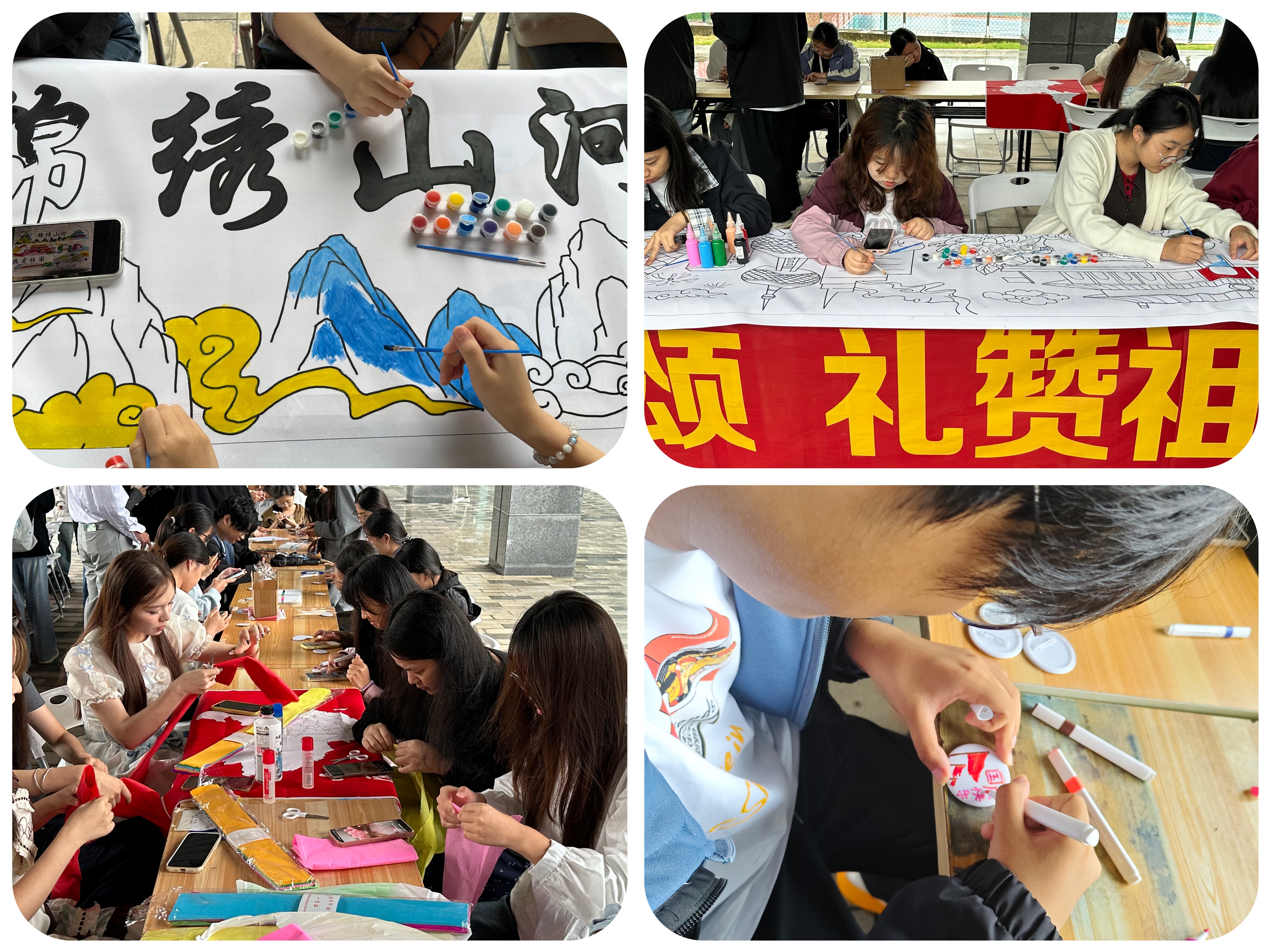 在“锦绣山河横幅”区,十米长卷缓缓铺开,天安门、长城、天坛等巍峨场景模板清晰可见,同学们以小组为单位接力创作,1个小时的协作中,画笔沙沙声与欢声笑语交织,最终呈现出一幅色彩斑斓的山河长卷。
