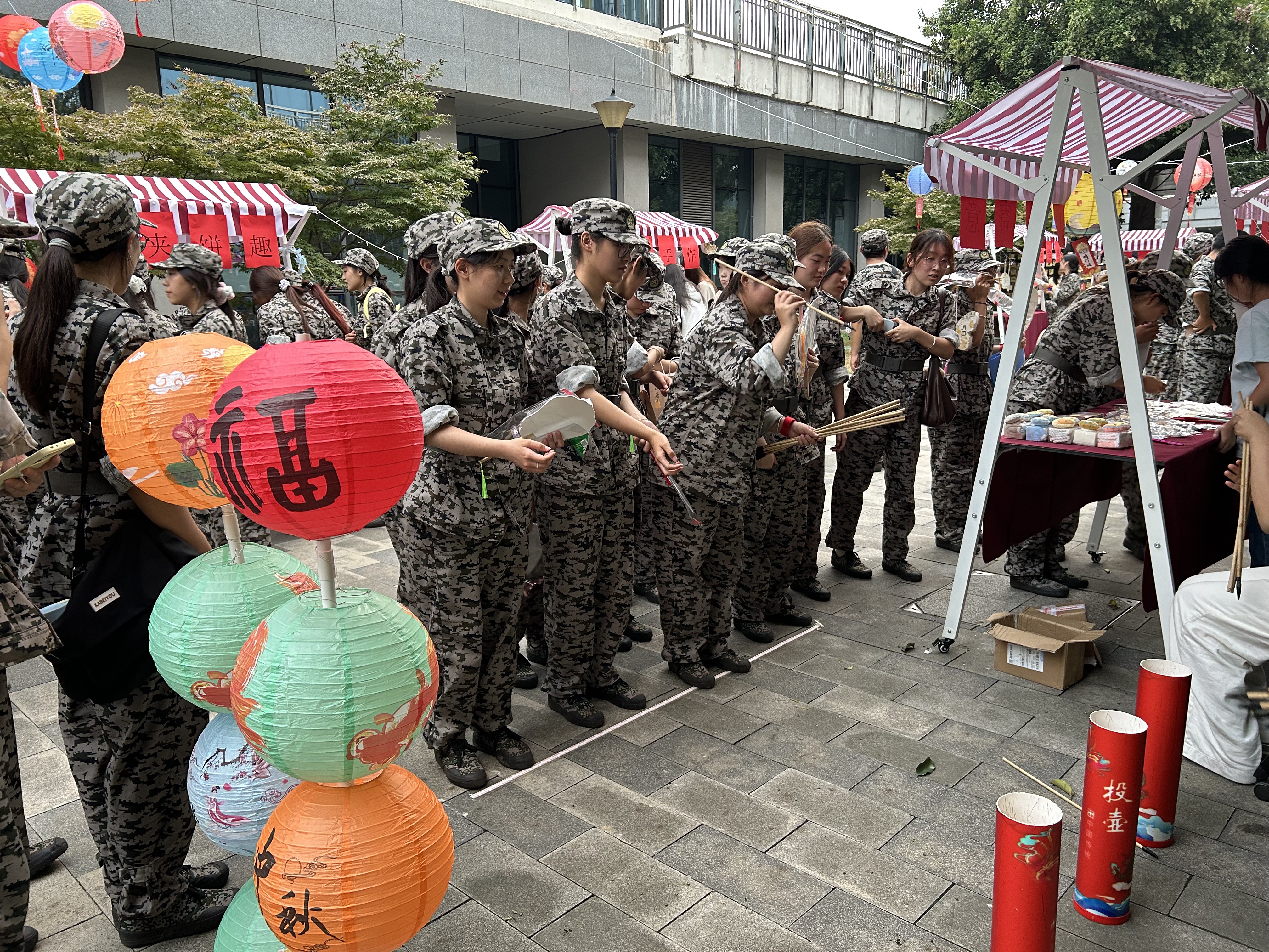 活动当日,现场热闹非凡,处处洋溢着欢声笑语,宛如一片欢乐的海洋。汇心湖校区活动现场设置了七大特色环节,将传统民俗与爱国元素巧妙融合。在“落笔签安康,双节庆华章”环节,同学们在签到卡上写下对家人的安康祝福与对祖国的美好祝愿,以笔墨传递深情;“猜谜赢盲盒,家国乐开花”环节,围绕中秋传统与国庆知识设计的灯谜,让同学们在趣味竞答中收获知识,答对者领取盲袋,答错也能获得国旗贴纸鼓励;“拼山河盛景,赛团圆心情”的拼图比赛,各组同学齐心协力拼搭“中秋月色下的中国地标”,在协作中感受祖国山河之美;“拼灯贺双节,手作忆团圆”与“漆扇映双辉,家国共欢归”环节,同学们自主拼接融合双节元素的灯笼、绘制扇面,用手作定格节日美好;“投壶寄心意,双节庆双喜”和“筷夹月饼趣,双节乐无极”环节,大家在传统游戏中比拼互动,累计积分兑换月饼、国庆徽章、中秋糕点等礼品。鼓山校区现场首先映入眼帘的是“星愿筑墙”环节。师生们纷纷驻足,拿起手中的素笺,认真思考着,将对未来的美好憧憬、对家国的深情祝福逐一书写下来;“投壶邀月”环节,参与者们手持箭矢,眼神专注而坚定,在规定距离外屏气凝神,准备投壶,每一次抬手、瞄准、投出,都凝聚着他们的期待和努力;而“中秋玉兔接福”“月是故乡明”“旋转钓兔子”“月饼大逃亡”等特色游戏区域,更是将中秋民俗与趣味竞技巧妙地融为一体。在“中秋玉兔接福”游戏中,师生们需要眼疾手快地抓住从空中落下的“福袋”,大家全神贯注,眼睛紧紧盯着“福袋”的下落轨迹,一旦时机成熟,便迅速出手,现场充满了紧张而刺激的氛围。“旋转钓兔子”游戏里,参与者们手持钓竿,努力钓起旋转的“兔子”,随着转盘的转动,他们的身体也跟着调整,但依然坚持不懈地尝试着。“月饼大逃亡”则要求参与者在规定区域内移动彩色的“月饼”,整个场区弥漫着浓浓的节日氛围。