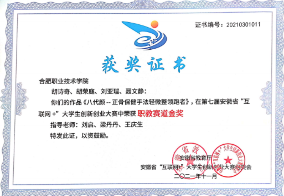 他积极指导学生参加专业技能竞赛和相关创新创业大赛,2019年指导学生获得安徽省大学生康复治疗技术技能竞赛一等奖,2020年指导学生获得第十届全国大学生电子商务“创新、创意及创业”安徽省赛区选拔赛二等奖,2021年指导学生获得第七届安徽省“互联网+”职教赛道金奖。