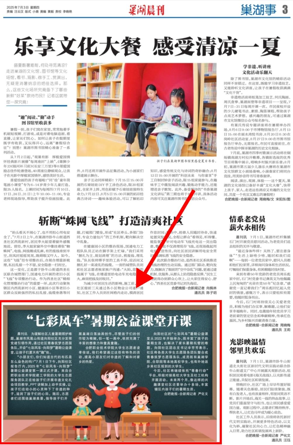 6月30日-7月6日,我校建筑工程学院“微光成炬 一路向阳”实践团走进巢湖市凤凰山街道向阳社区,开展为期一周的“七彩风车?向阳梦”暑期公益课堂活动。7名实践团成员带着精心设计的课程方案,为社区儿童带来了一段充实而有趣的学习时光。