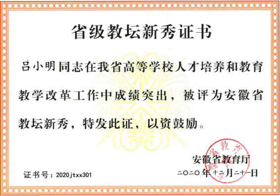 付出总有回报,“赠人玫瑰,手有余香”,吕小明多次获得“优秀教师”“年度先进个人”“优秀实验员”“优秀社团指导老师”“优秀班主任”等称号; 2017年全国高等职业院校教学能力大赛“二等奖”,2020年获省级教学成果“二等奖”;2020年获省级“教坛新秀”;入校以来获得7次教学质量考核优秀。