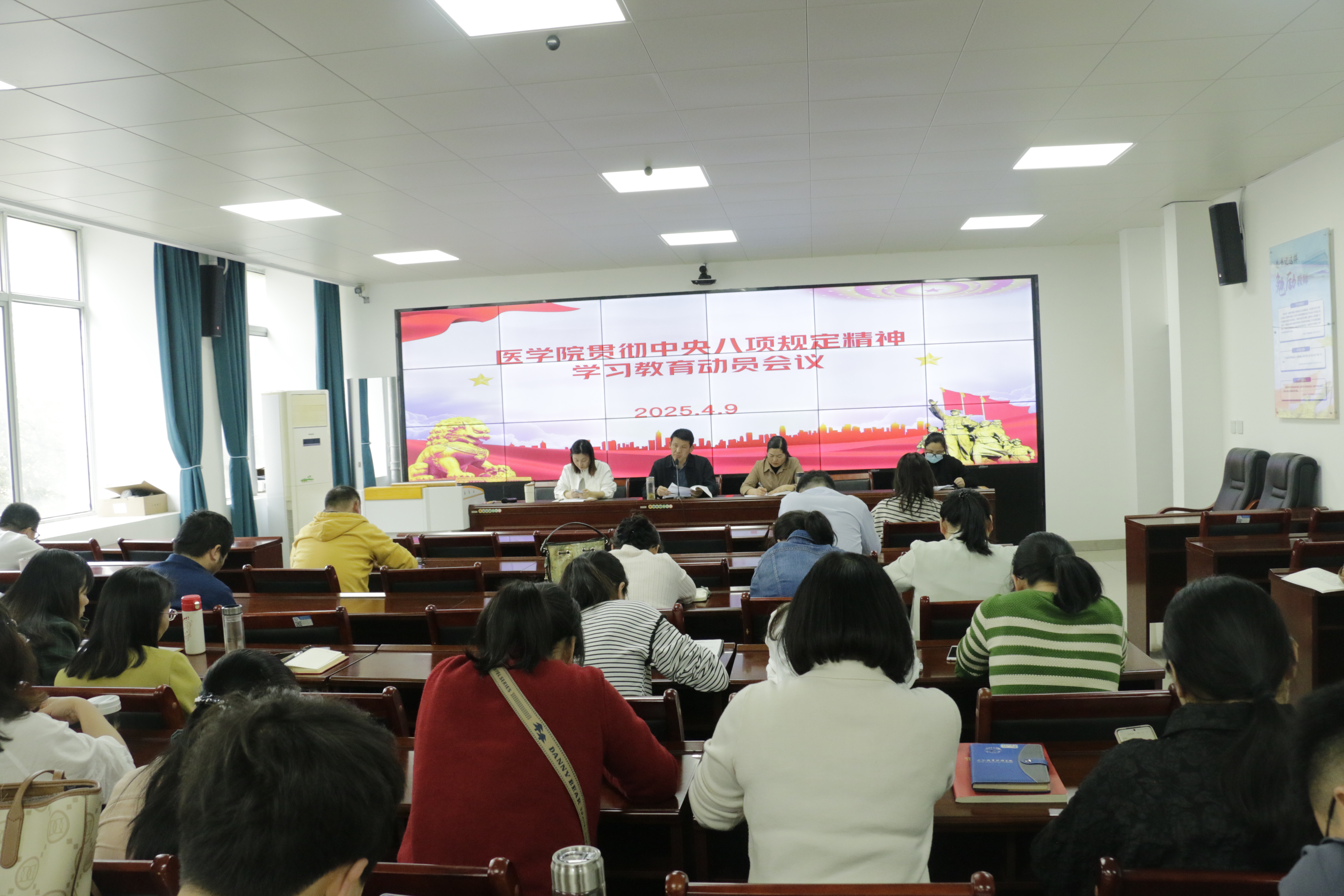 4月9日,根据学校党委的统一部署,医学院党总支在医学楼216会议室召开深入贯彻中央八项规定精神学习教育动员部署会。医学院全体教师党员参加会议,会议由医学院党总支副书记(主持工作)邹华兵主持。